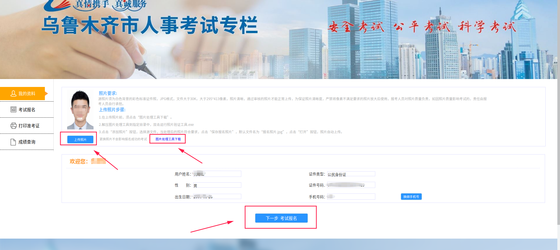 六、完成登录后,上传符合要求的照片(可用图片处理工具进行处理),并核对身份信息,完成后进行下一步操作。