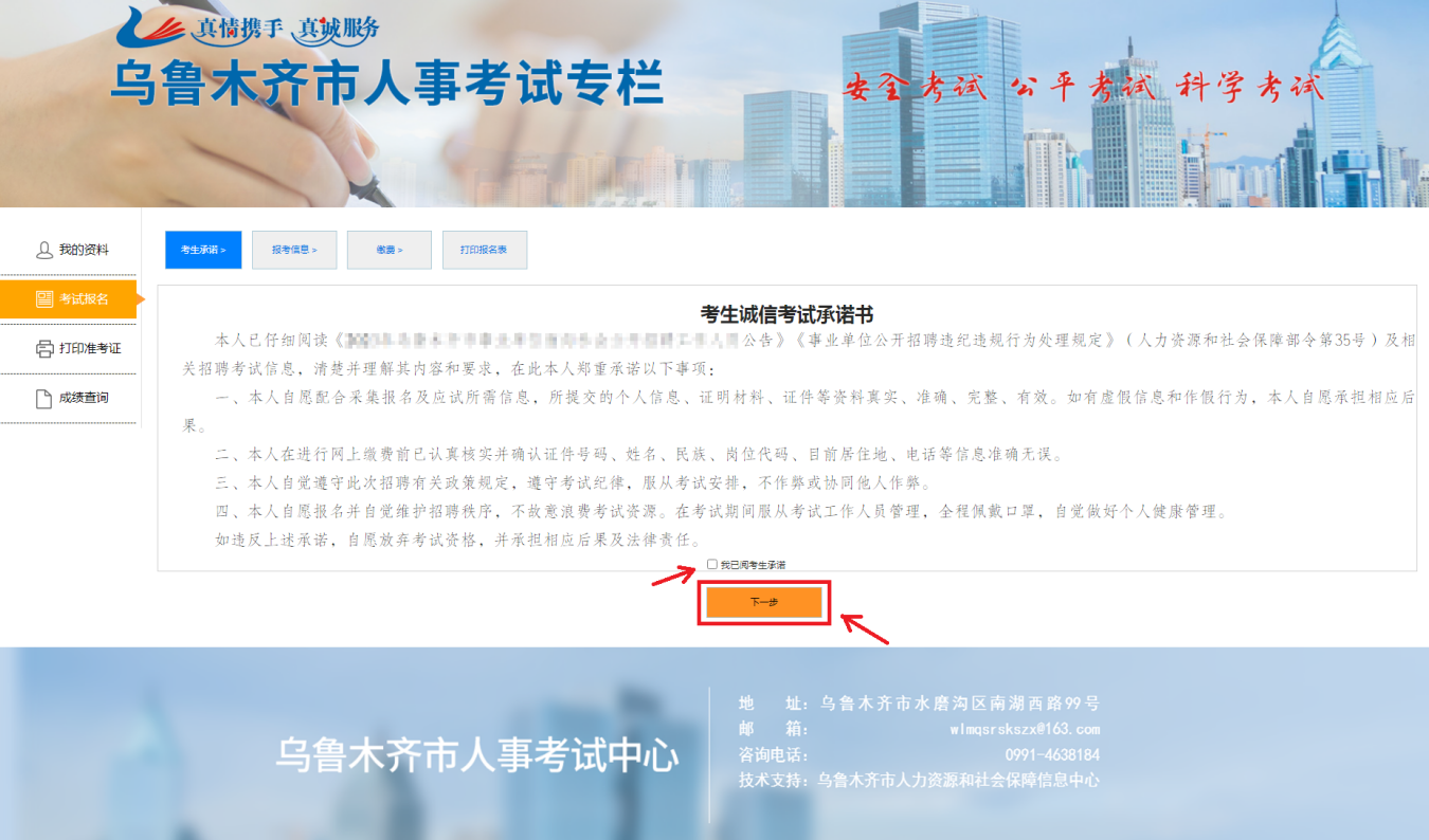 八、阅读“考生诚信考试承诺书”,勾选“我已阅考试承诺”选项,进行下一步操作;