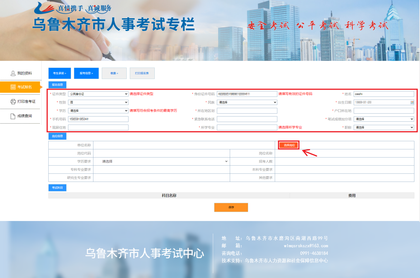 九、按要求填写报考所需的身份、专业、学历、职称、加分项等信息,信息确认无误后点击“选择岗位”进行下一步操作;