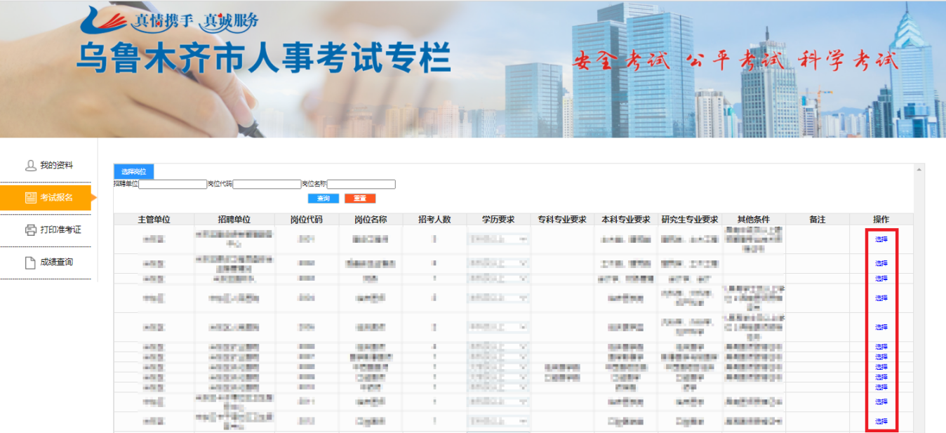 十、进入选择岗位界面,选择自身符合要求的岗位,在对应岗位后点击“选择”;