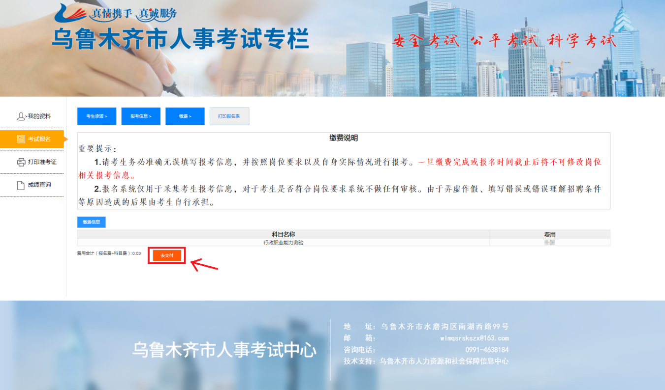 十三、查看缴费说明并确认考试费用,点击“去支付”进行报名缴费;