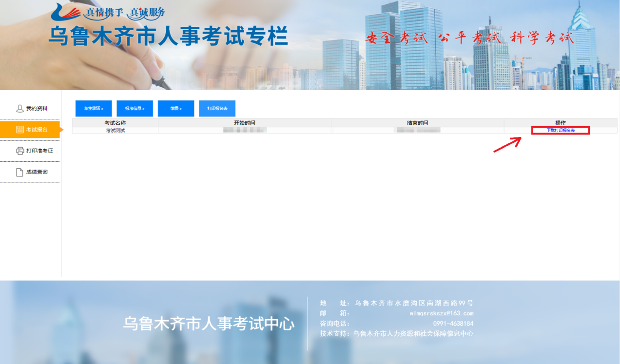 十六、支付状态变为“已支付”即表示缴费成功(报名成功),点击“打印报名表”,进行下一步操作,如支付状态未改变请刷新报名系统页面,持续未改变,请联系报名技术服务电话:0991-4638184;